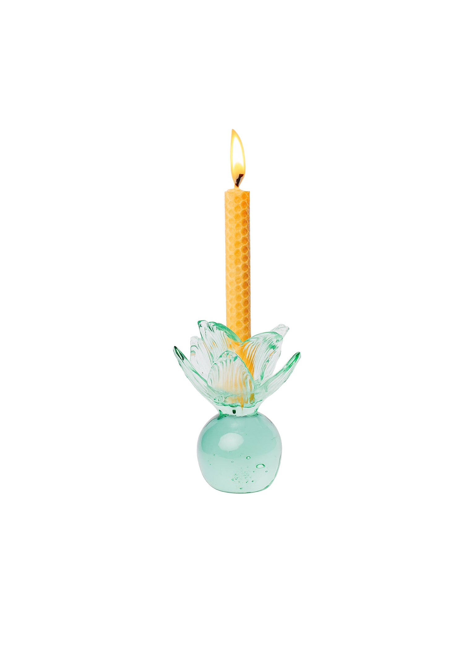 El Candelabro Flora es una pequeña escultura inspirada en la naturaleza. Una esfera maciza sostiene, como si brotara de ella, una flor delicada que recibe la vela.