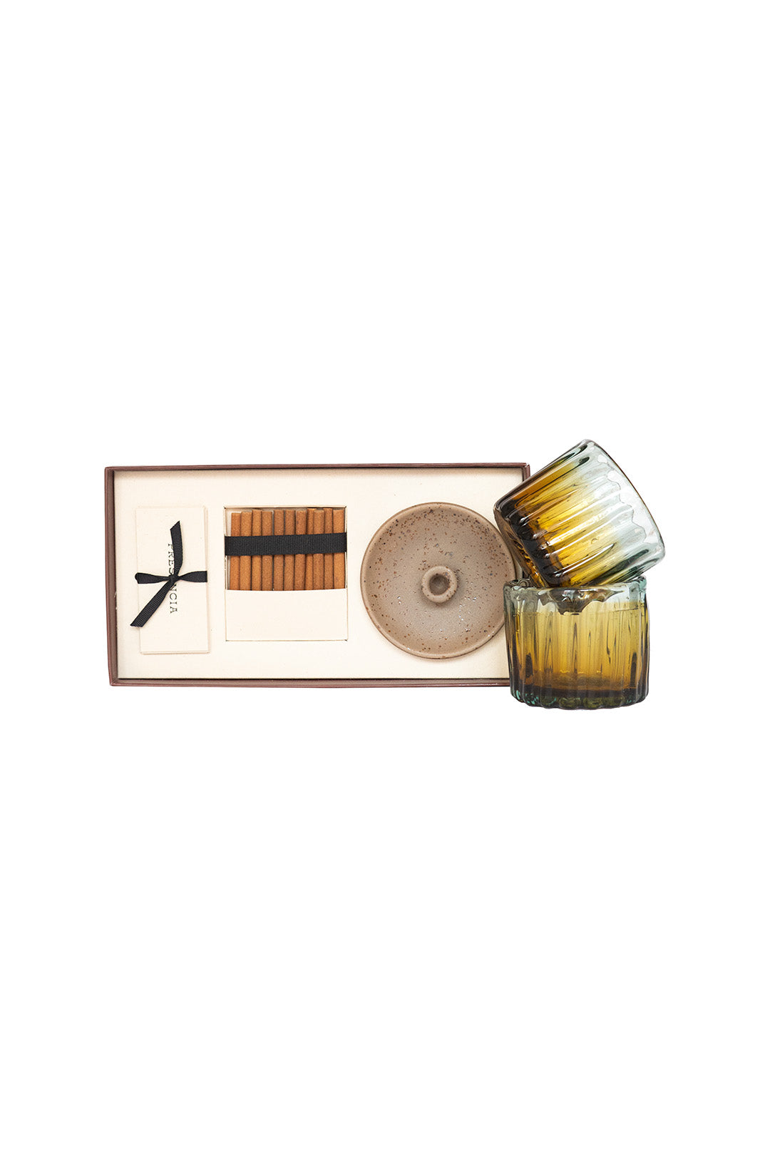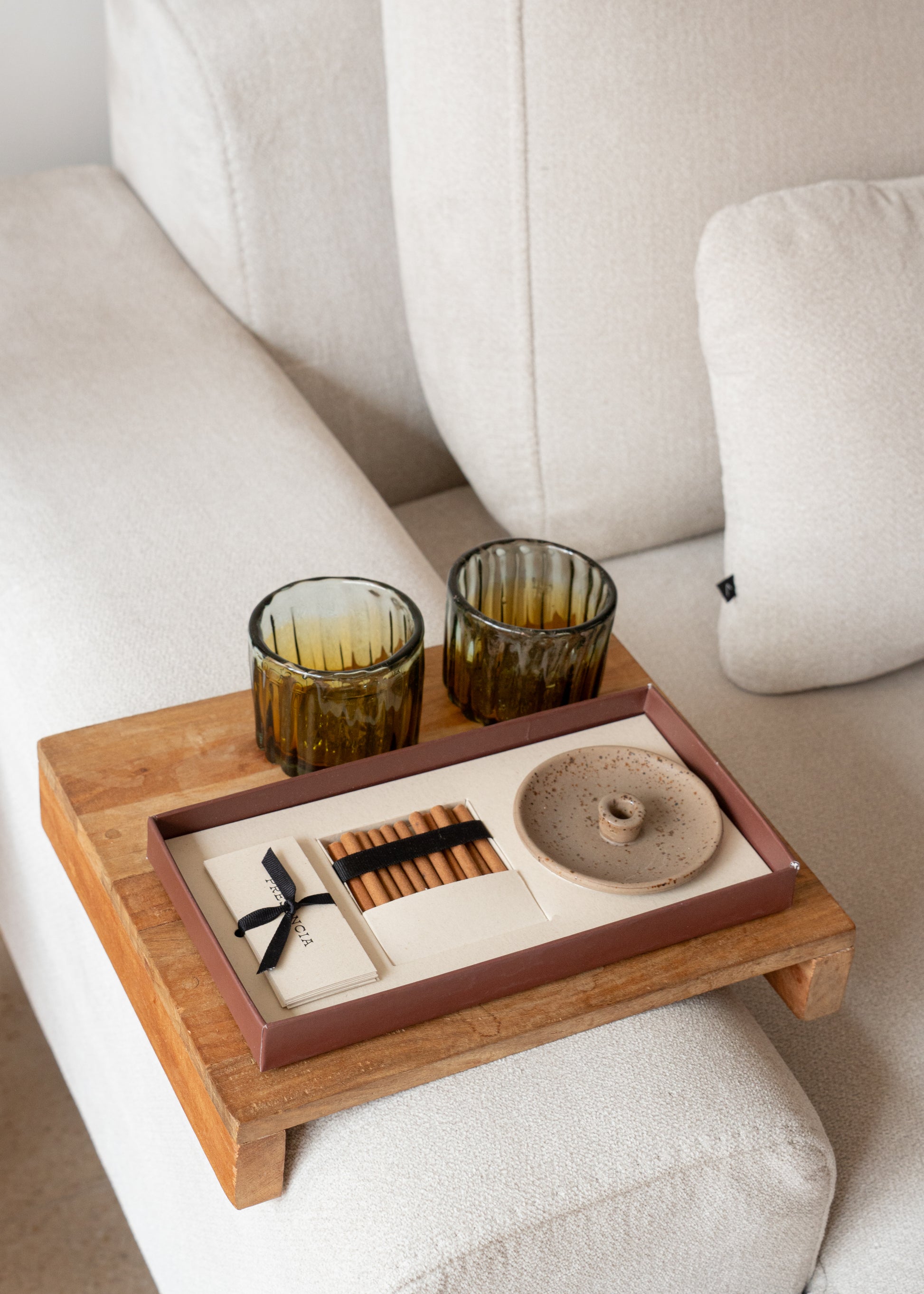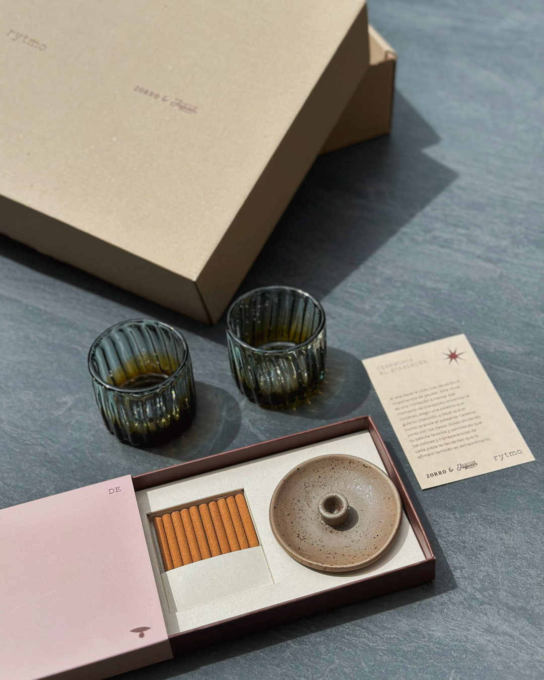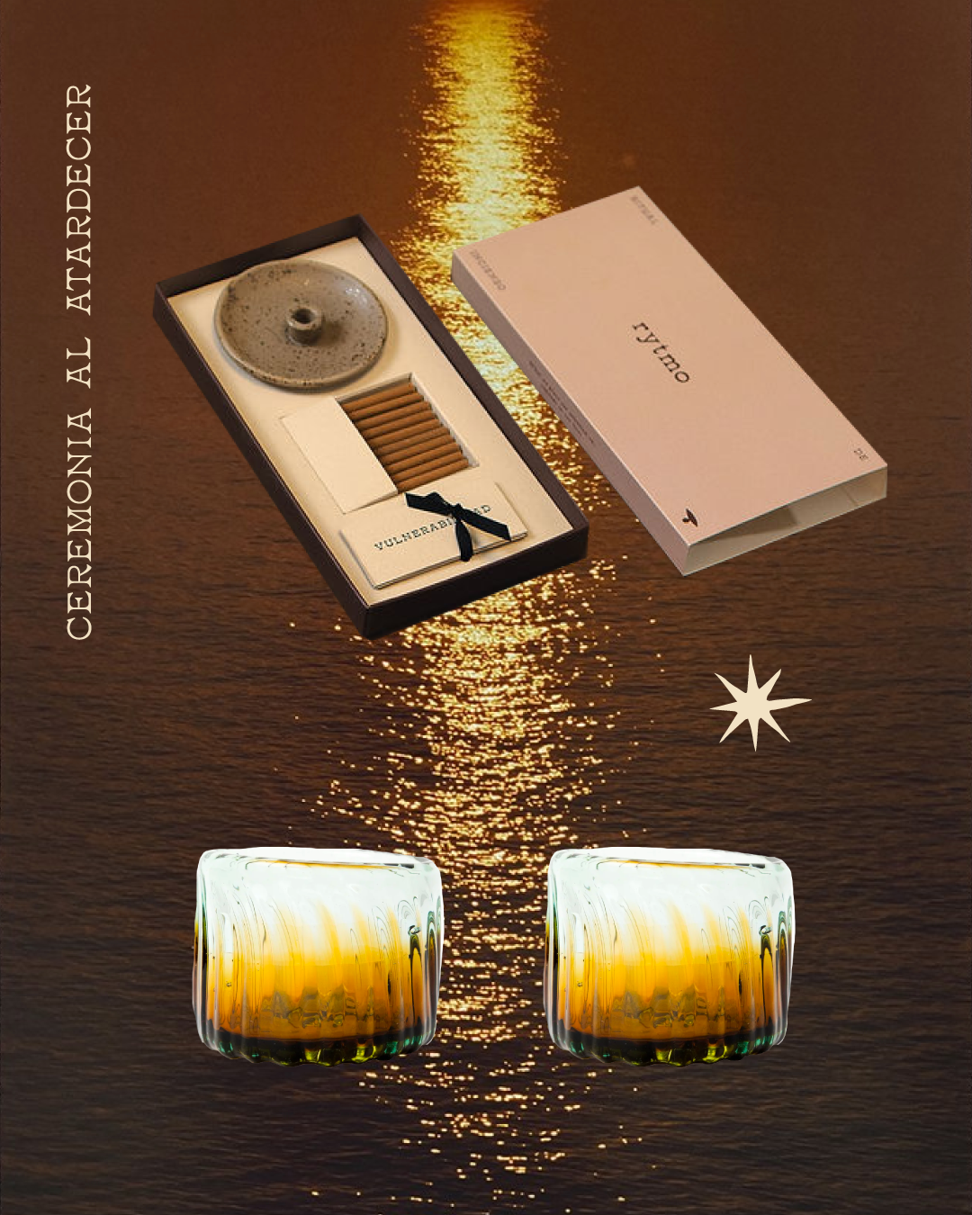 Al atardecer el cielo nos recuerda la importancia de pausar. Este ritual es una invitación a honrar ese momento de transición: encender el incienso, elegir una palabra que guíe tu intención, y dejar que el humo te ancle al presente. Celebrar junto con los vasos ocaso sirviendo tu bebida favorita y permitiendo que los colores y transparencia de cada pieza te recuerden que lo efímero también es extraordinario.