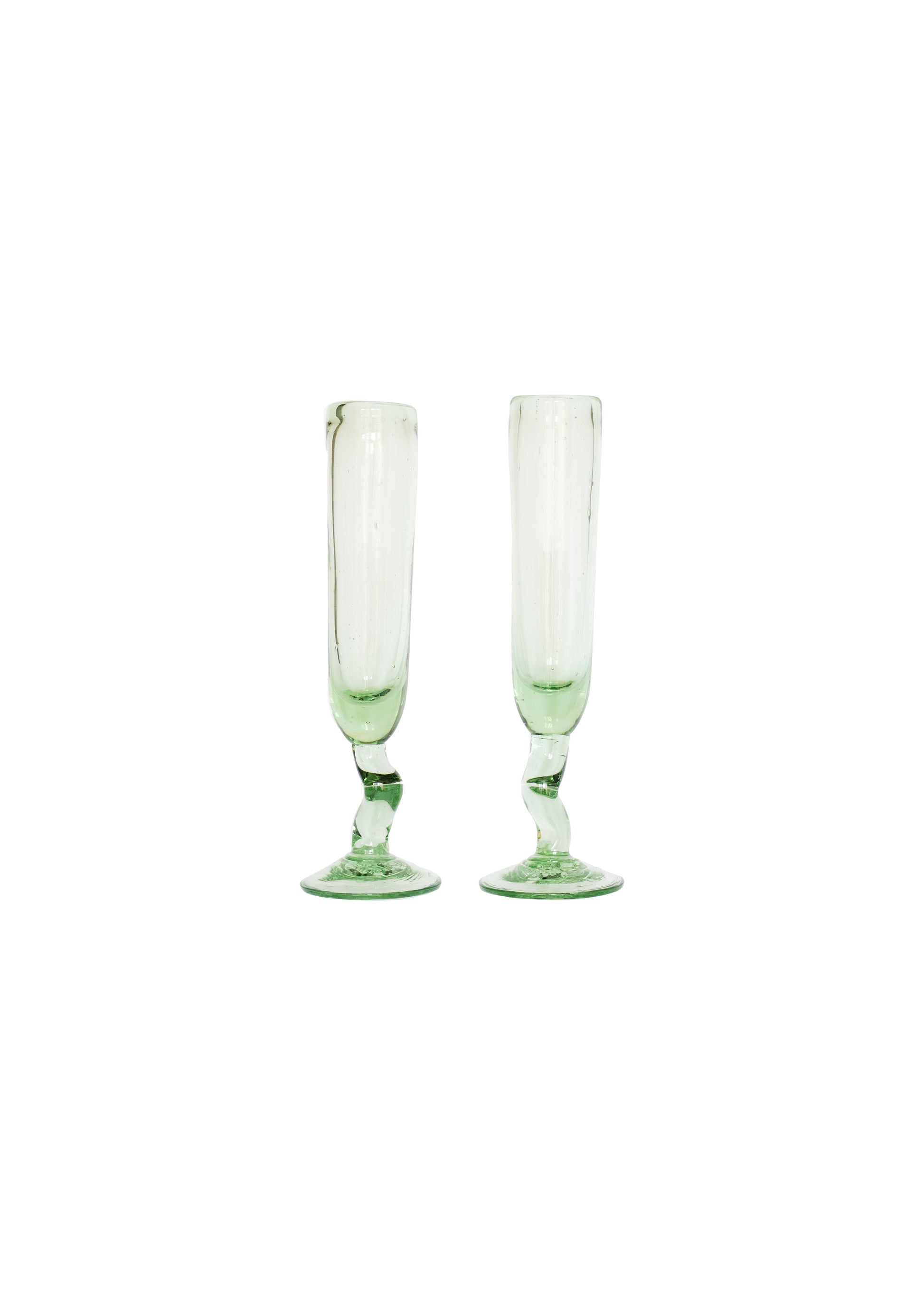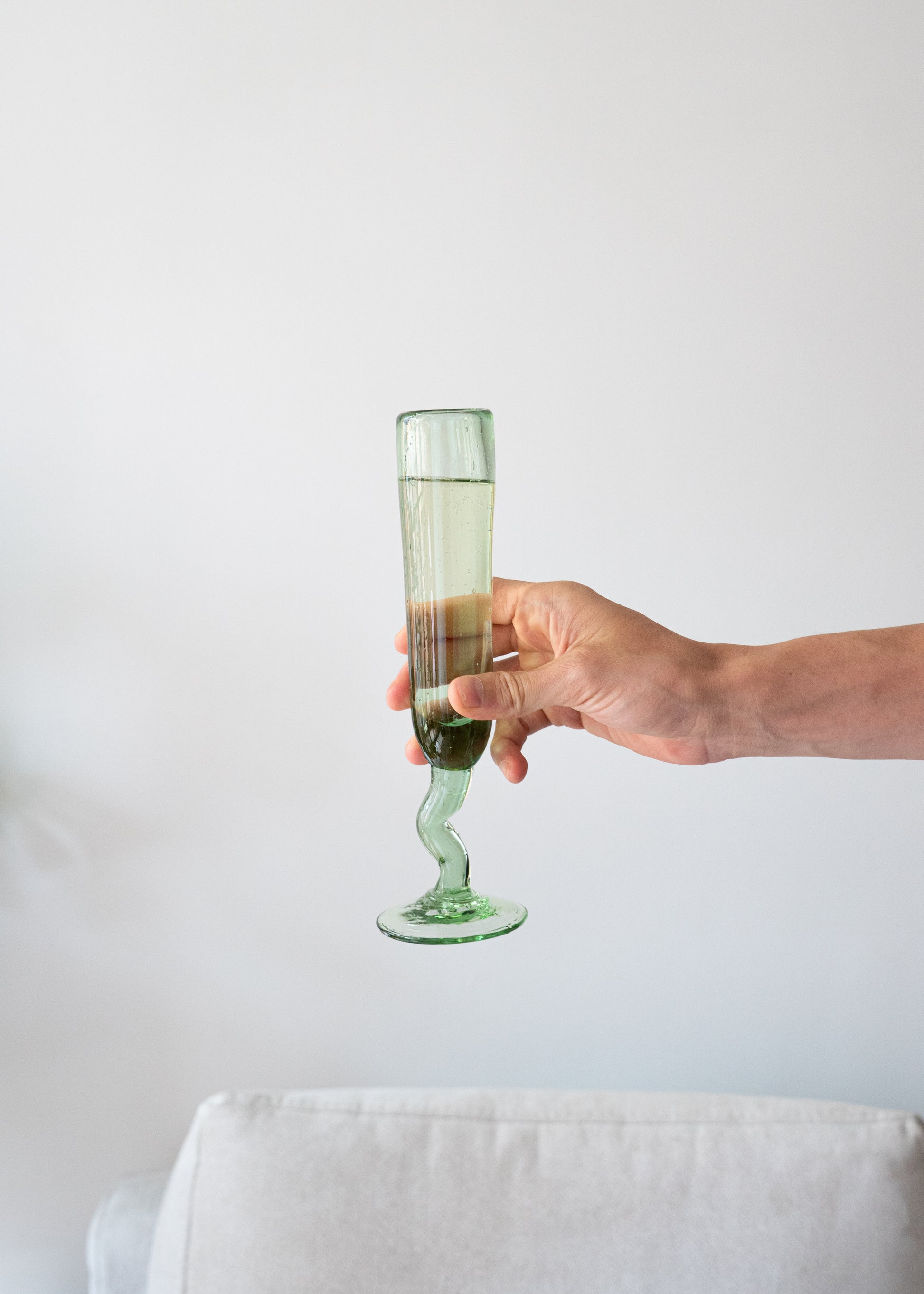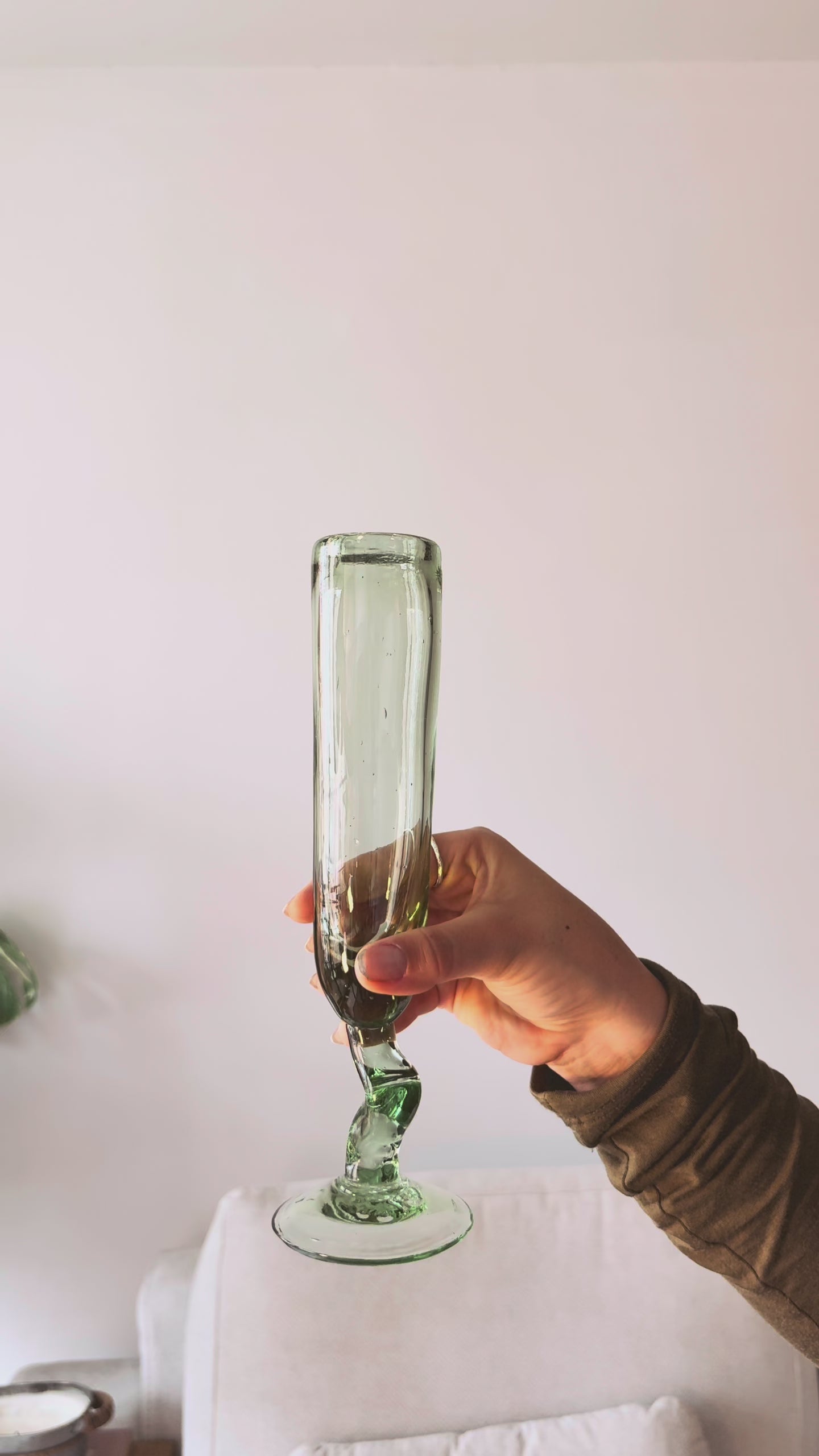 Incluye dos copas de champaña hechas a mano en vidrio soplado, con la transparencia y delicadeza que deja pasar la luz y convierte cada sorbo en un pequeño ritual.