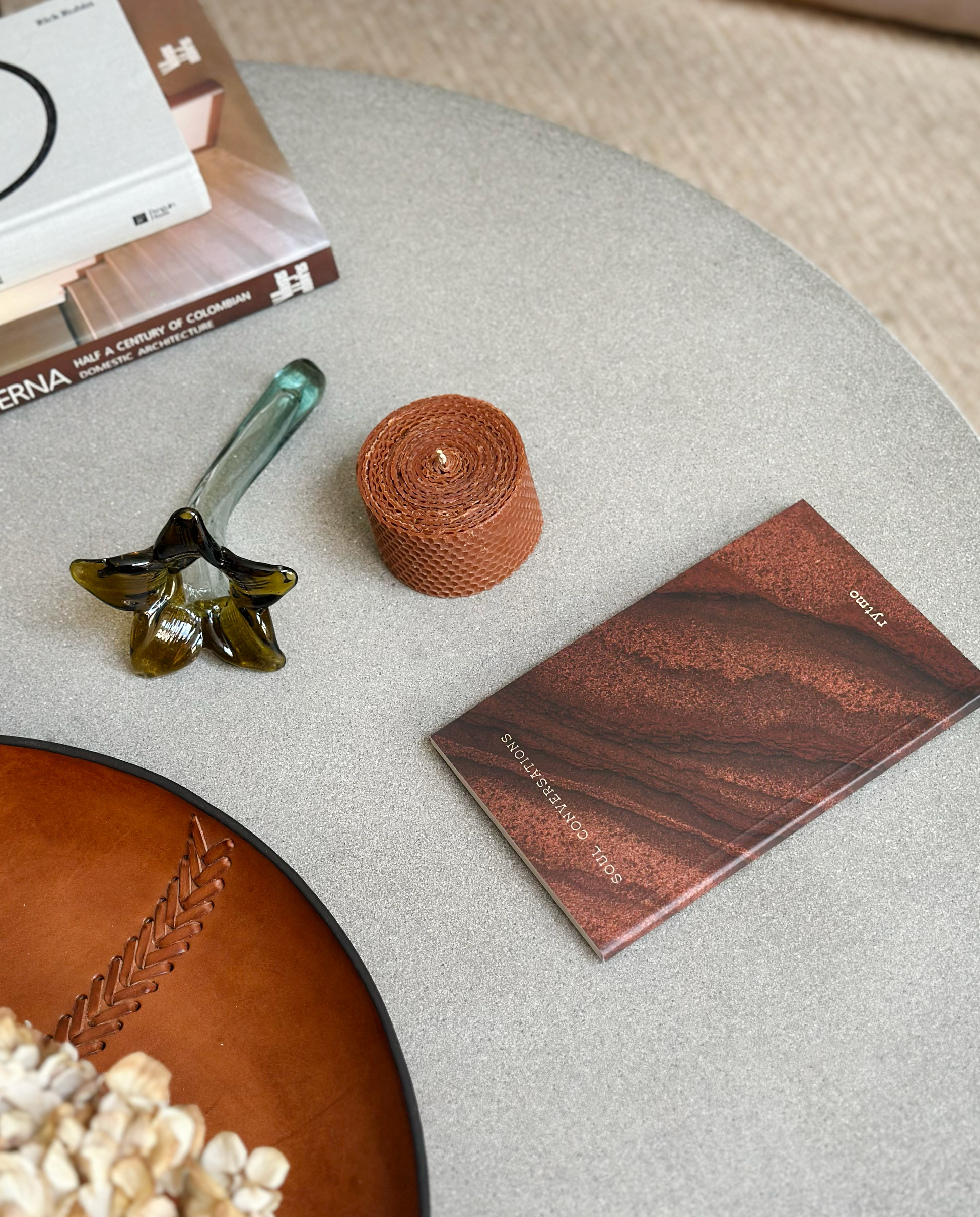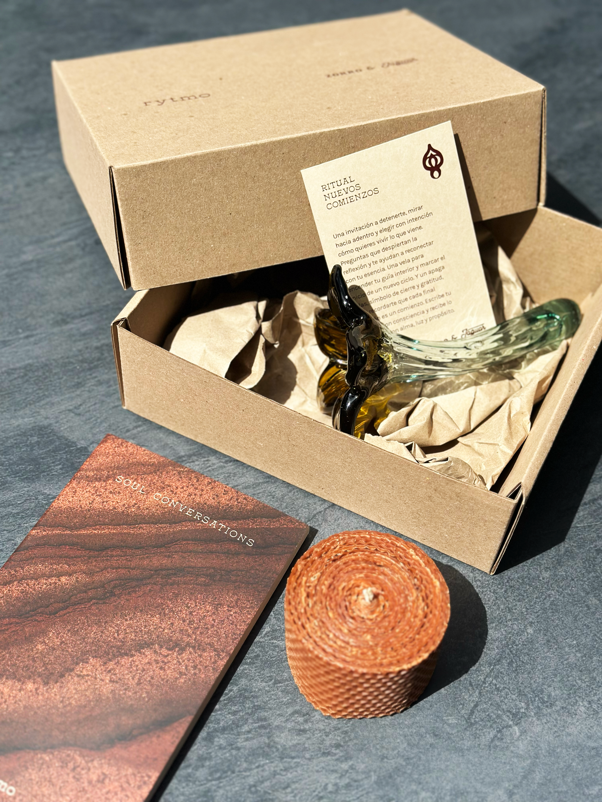 Preguntas que despiertan la reflexión y te ayudan a reconectar con tu esencia. Una vela para encender tu guía interior y marcar el inicio de un ciclo. Y un apagavelas, símbolo de cierre y gratitud.